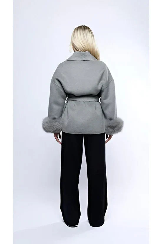 • The refined wrap design with a matching belt adds a sophisticated touch, while thesoft fabric provides cozy warmth.